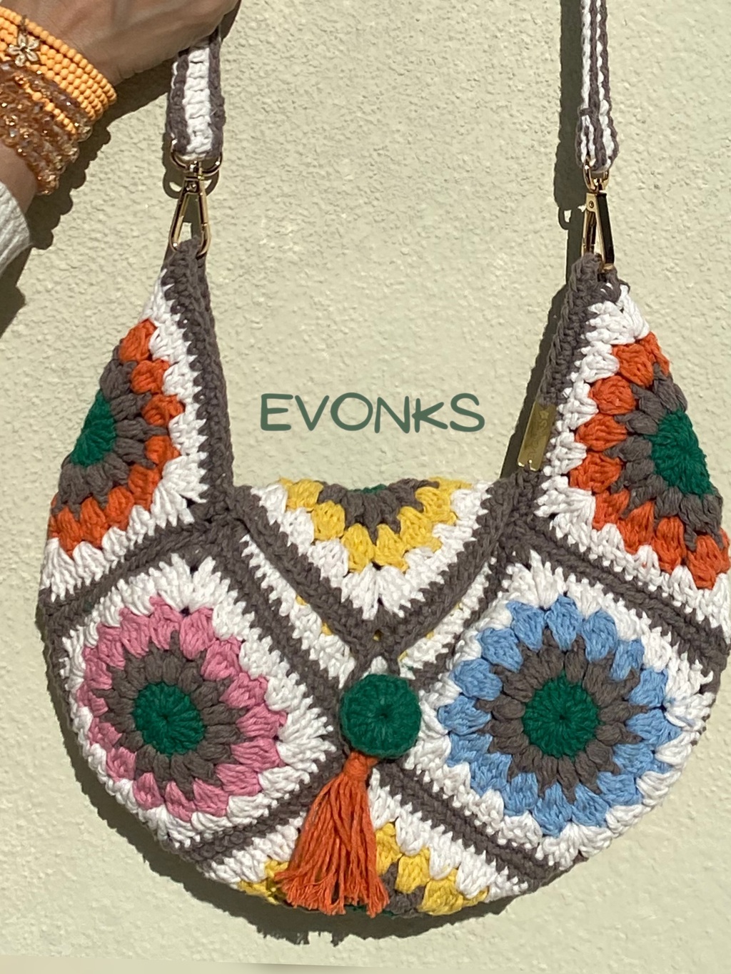 Bolsa Girassol da marca Evonks é uma peça única, feita à mão com linha algodão , que traduz o estilo boho tropical com cor, leveza e alma artesanal, que transmite alegria, luz e vitalidade para compor looks criativos, afetivos e cheios de personalidade.