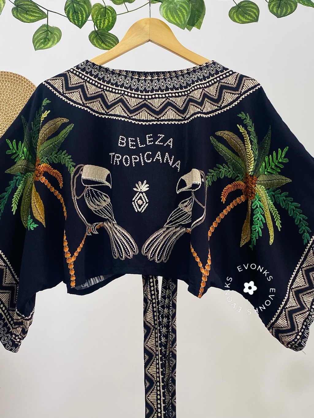Cropped: Cropped Nozinho tem as mangas estilo morcego, mangas soltas, possui amarração na frente onde você pode usar transpassado. Não possui bojo. Fundo na cor Preto.