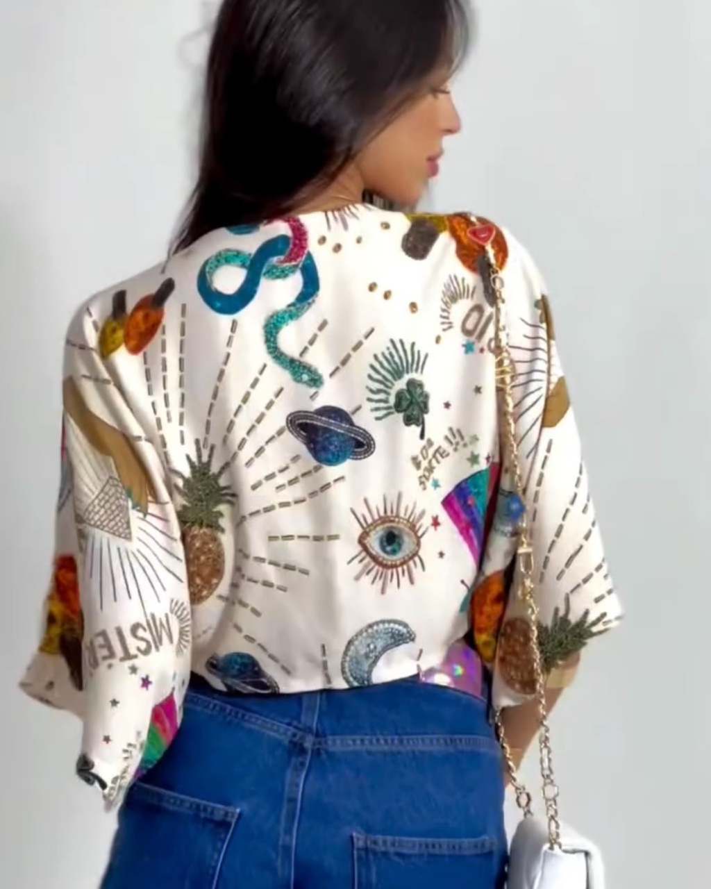 O Cropped Multiformas é confeccionado em tecido viscose que proporciona conforto e caimento à sua peça. Com estampas exclusivas, tem mangas largas e soltas, em estilo morcego. Tem decote em V (sem fechamento) e amarração na frente, para modelar da forma que você preferir. Na parte de trás, ele é fechado. Sem bojo e sem forro. O comprimento dele é até acima da linha da cintura (umbigo à mostra).
