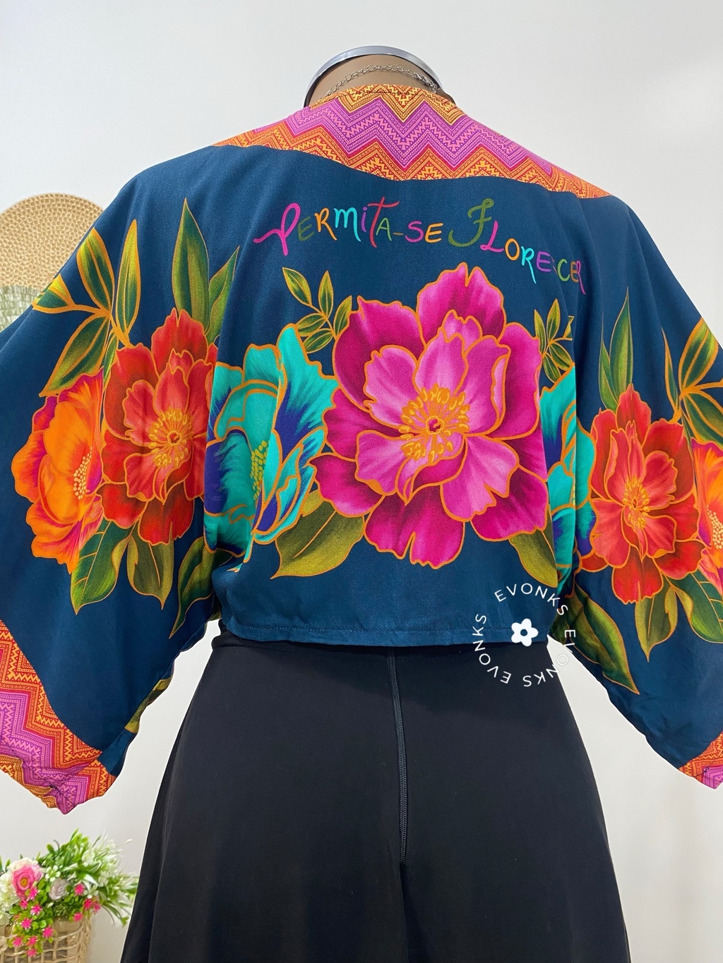 O Cropped Multiformas Permita-se Florescer é confeccionado em tecido viscose que proporciona conforto e caimento à sua peça. Com estampas exclusivas, tem mangas largas e soltas, em estilo morcego. Tem decote em V (sem fechamento) e amarração na frente, para modelar da forma que você preferir. Na parte de trás, ele é fechado. Sem bojo e sem forro. O comprimento dele é até acima da linha da cintura (umbigo à mostra).