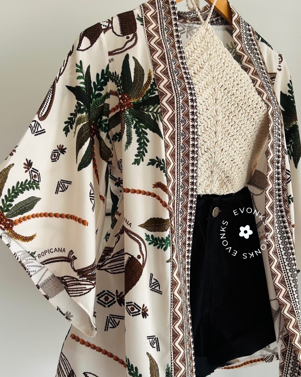 O Kimono Paraíso Tropical é a peça perfeita para quem quer trazer um pedacinho do verão brasileiro para o seu guarda-roupa! Com uma estampa linda de folhagens de coqueiros , abacaxis, Fundo da cor é Off-white, ele é super versátil e combina com jeans, leggings, vestidos ou shorts de tecido. Feito em 100% viscose com gramatura de 160( durabilidade, maciez, conforto), seu tecido é leve e fresco, ideal também para os dias quentes. O tamanho único veste do 36 ao 44, com mangas soltas que garantem conforto e estilo. Cabe até em uma bolsa pequena, perfeito para levar na sua rotina! 🌴🍍