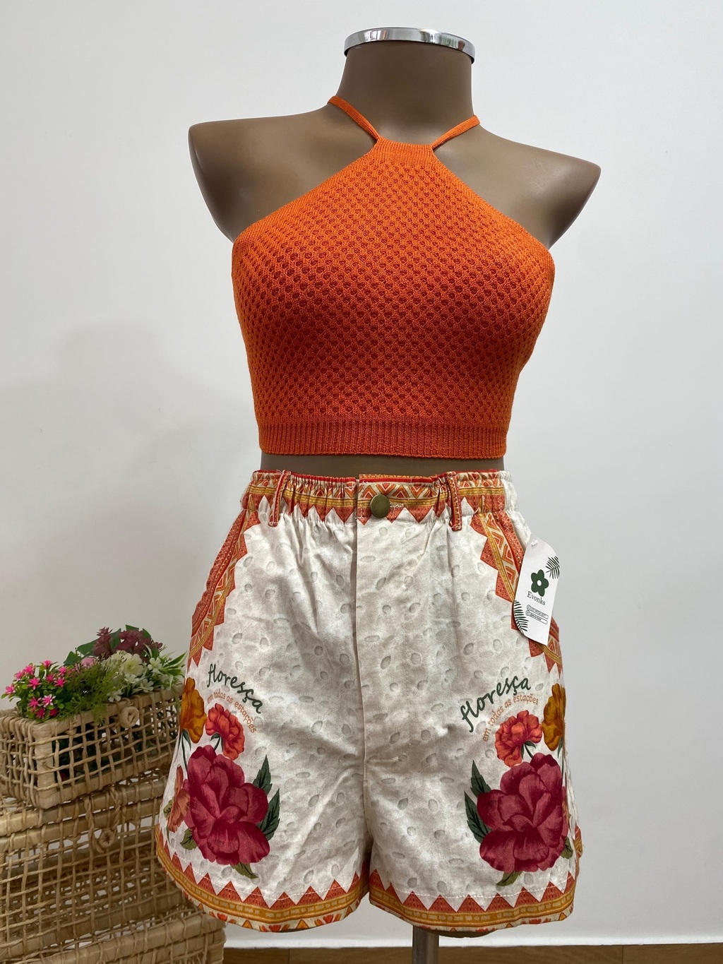 O Short possui elástico em volta da cintura, possui bolso nas laterais, Ziper e botão na frente. Fundo da cor é Off-white.