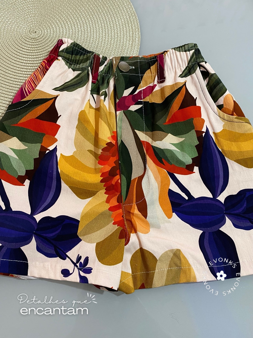 O Short possui elástico em volta da cintura, possui bolso nas laterais, Ziper e botão na frente.