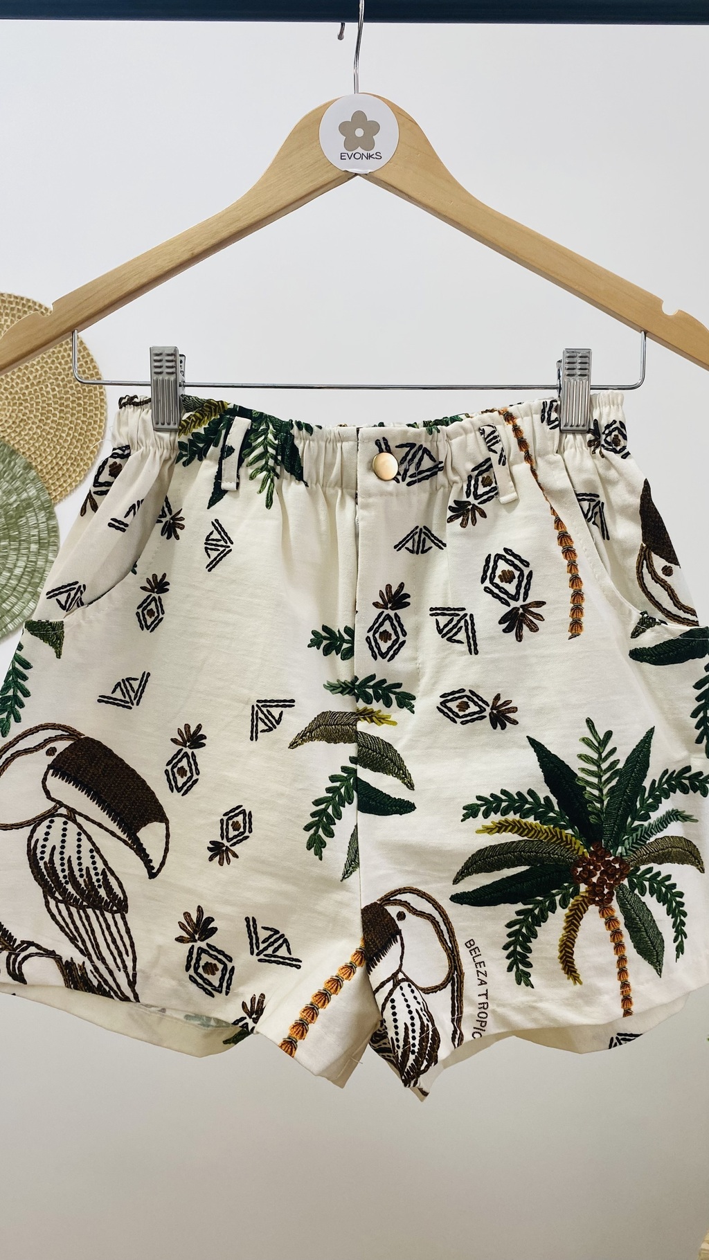 O Short possui elástico em volta da cintura, possui bolso nas laterais, Ziper e botão na frente. Fundo da cor é Off-white.