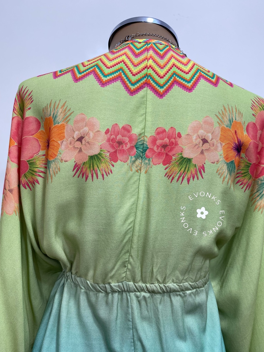 As mangas soltas e o punho com elástico permitem um ajuste perfeito, enquanto o decote V na parte frontal valoriza o busto. A parte de trás é totalmente fechada, garantindo um visual sofisticado.